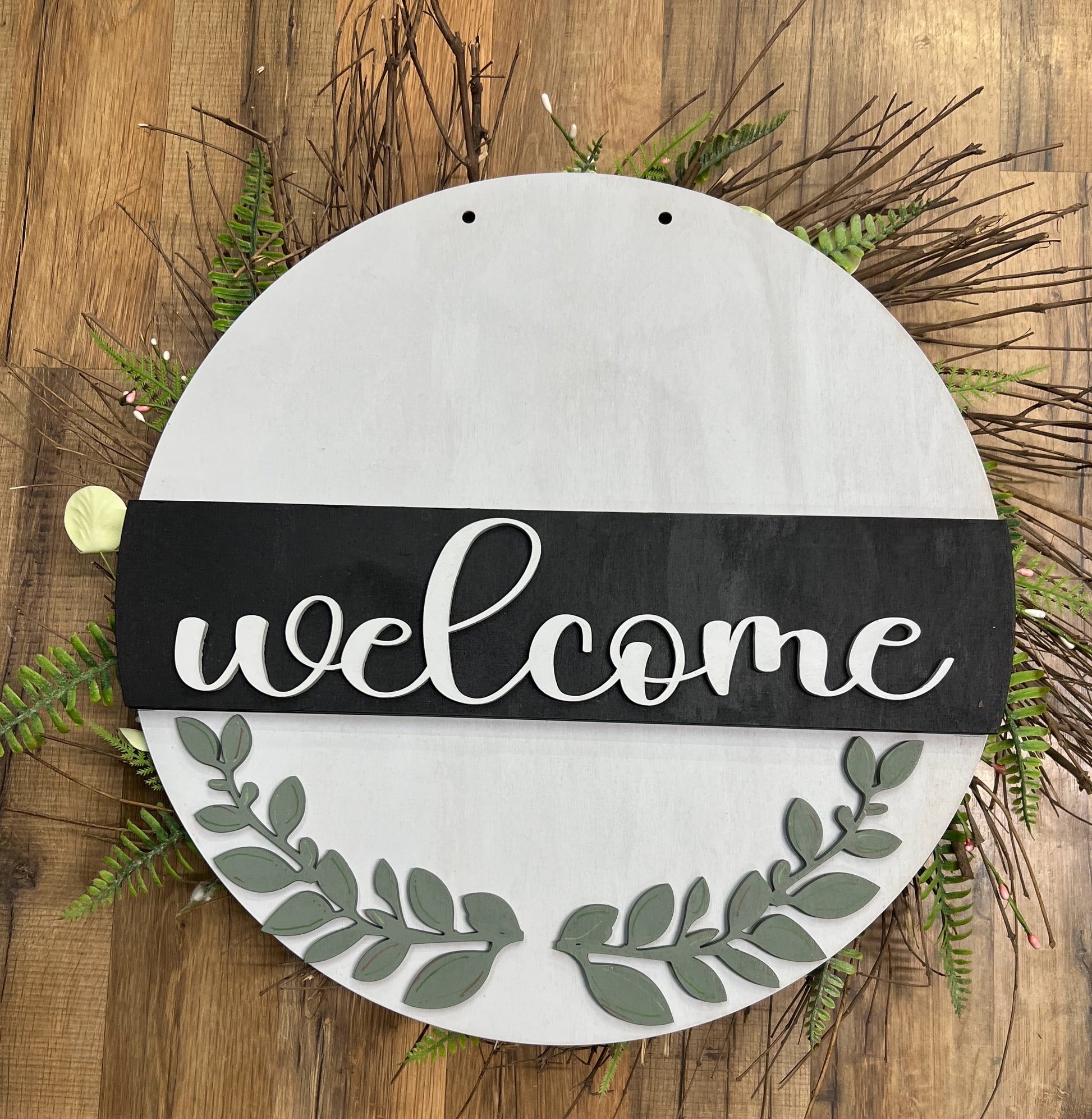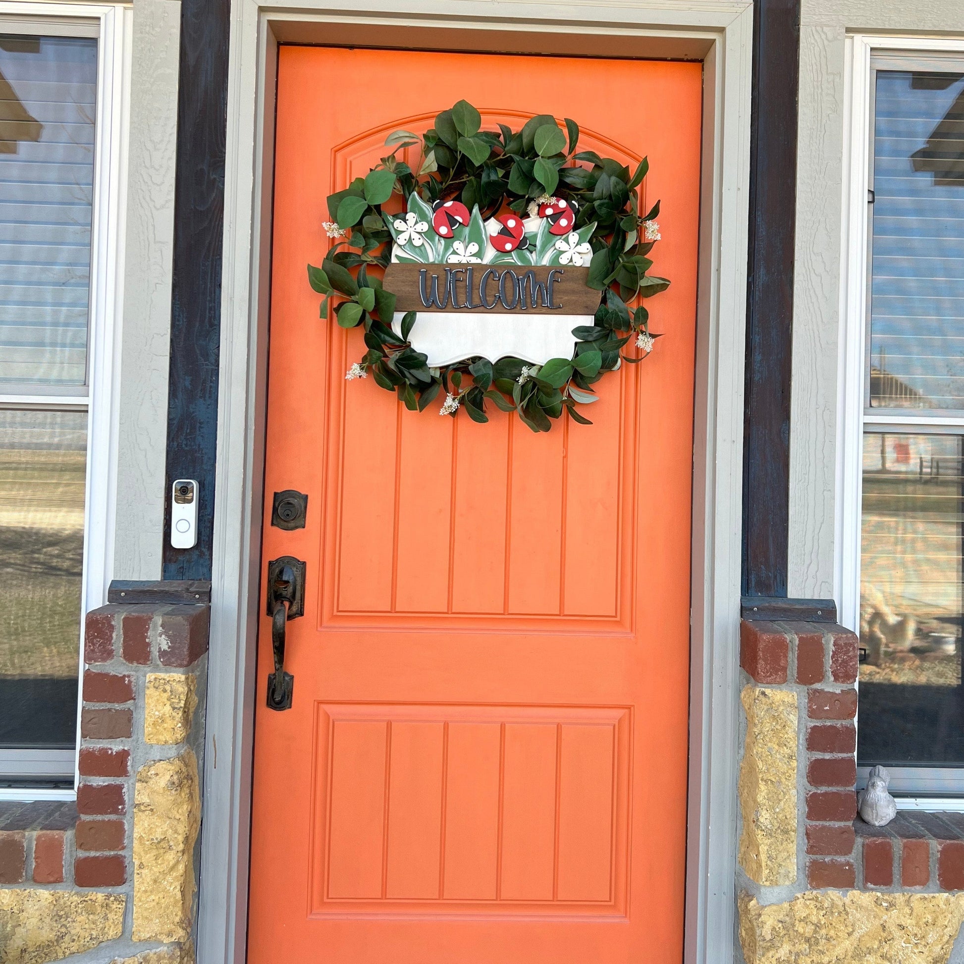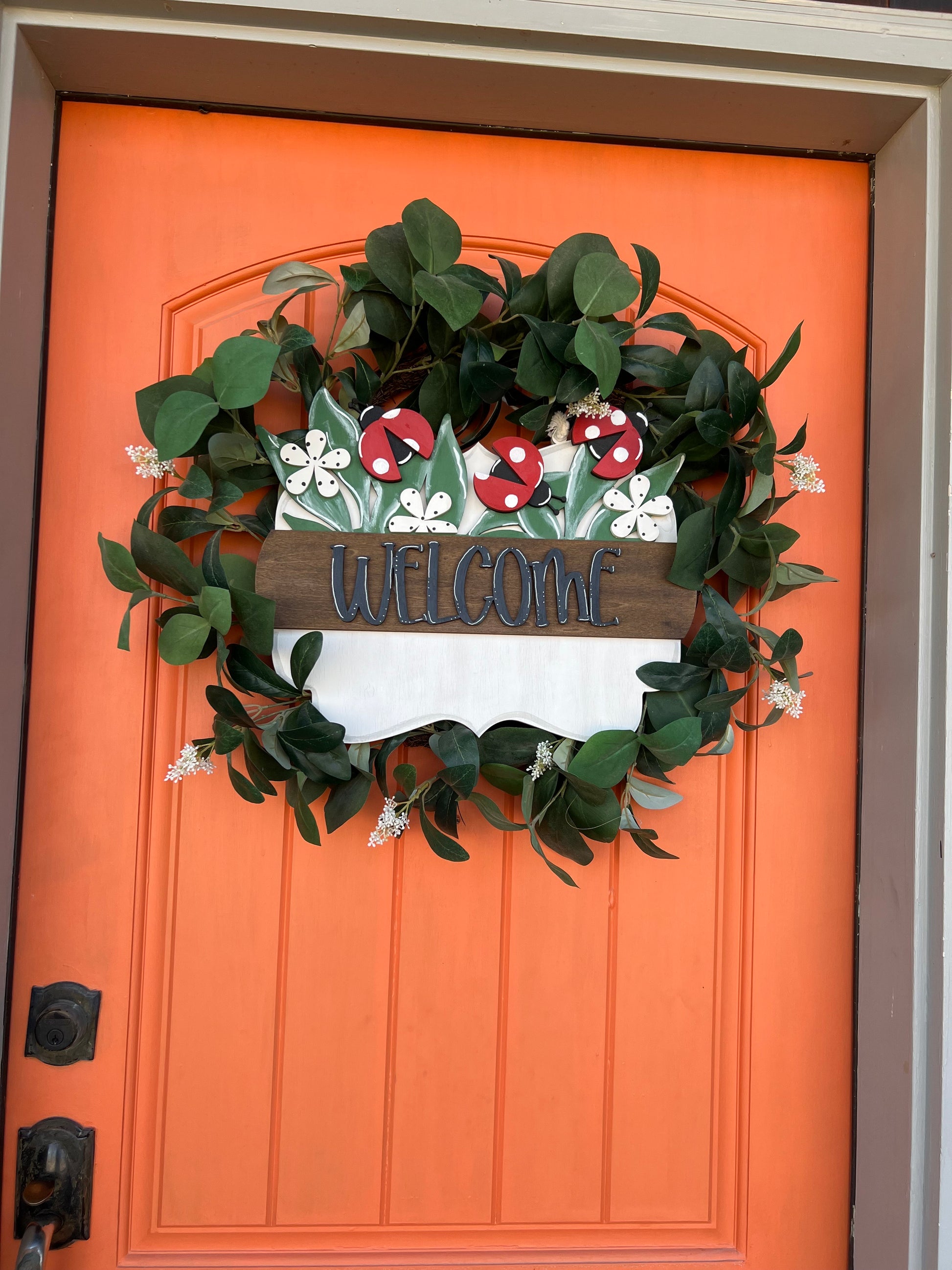 What a different and unique door hanger! The scalloped interchangeable Seasonal Insert is perfect for your door. Add a wreath behind the scalloped interchangeable Seasonal Insert for added interest.