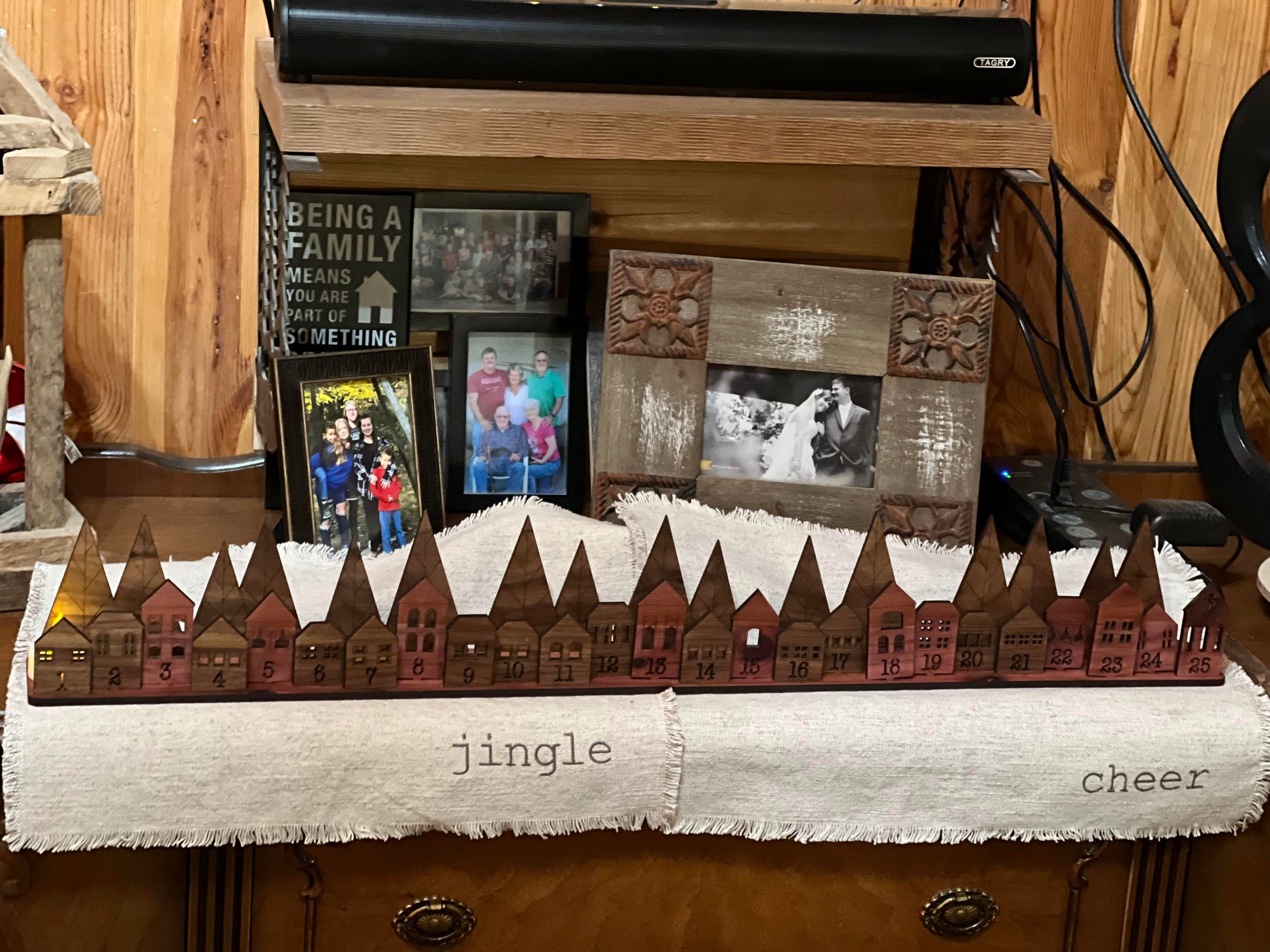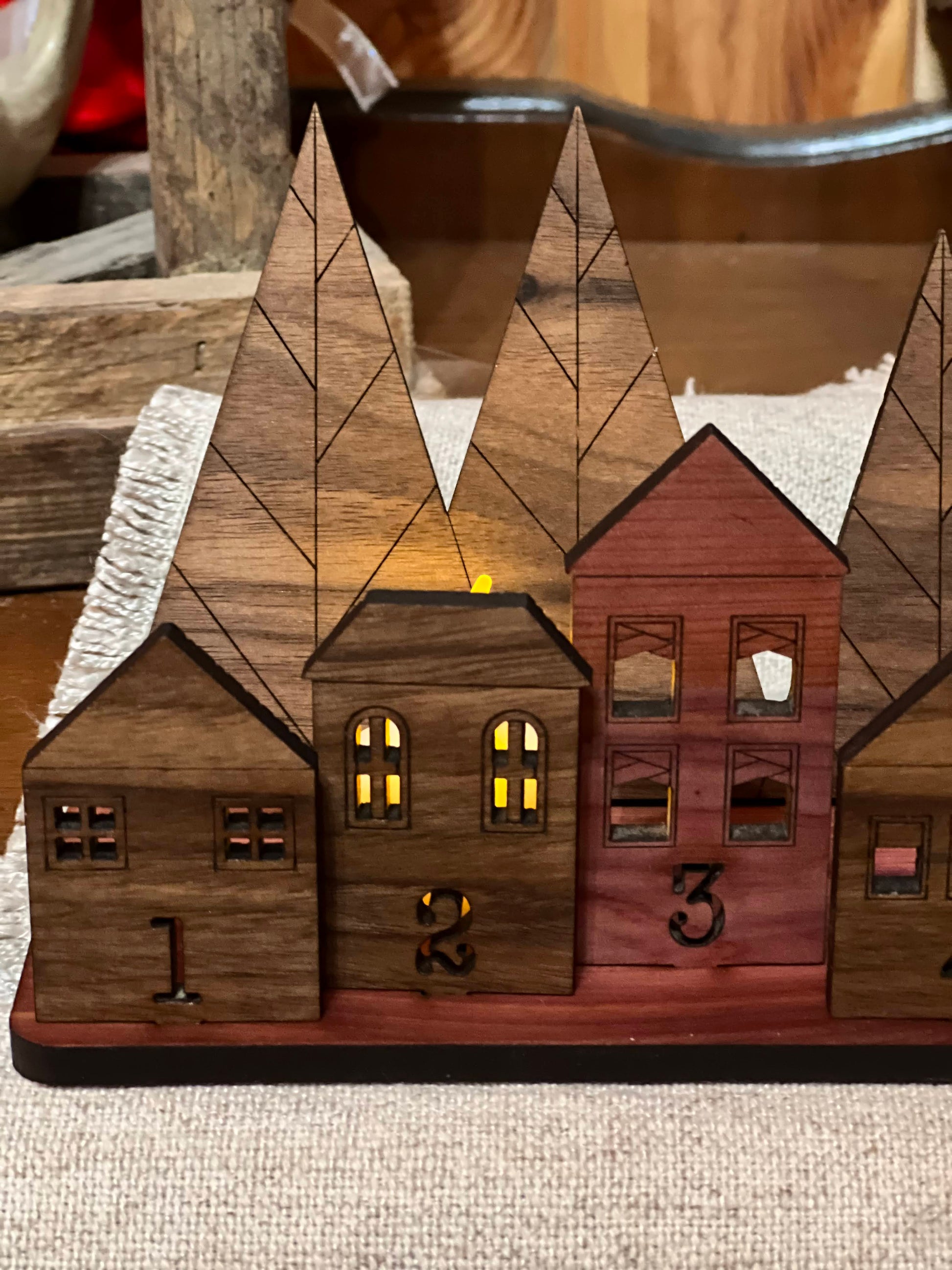 The Advent Village Calendar is the perfect touch to a minimalist style. It is a 24" long Cedar piece that holds each of the 25 houses and trees. The trees and houses are made from Cedar and Mahogany making a beautiful combination of woods .