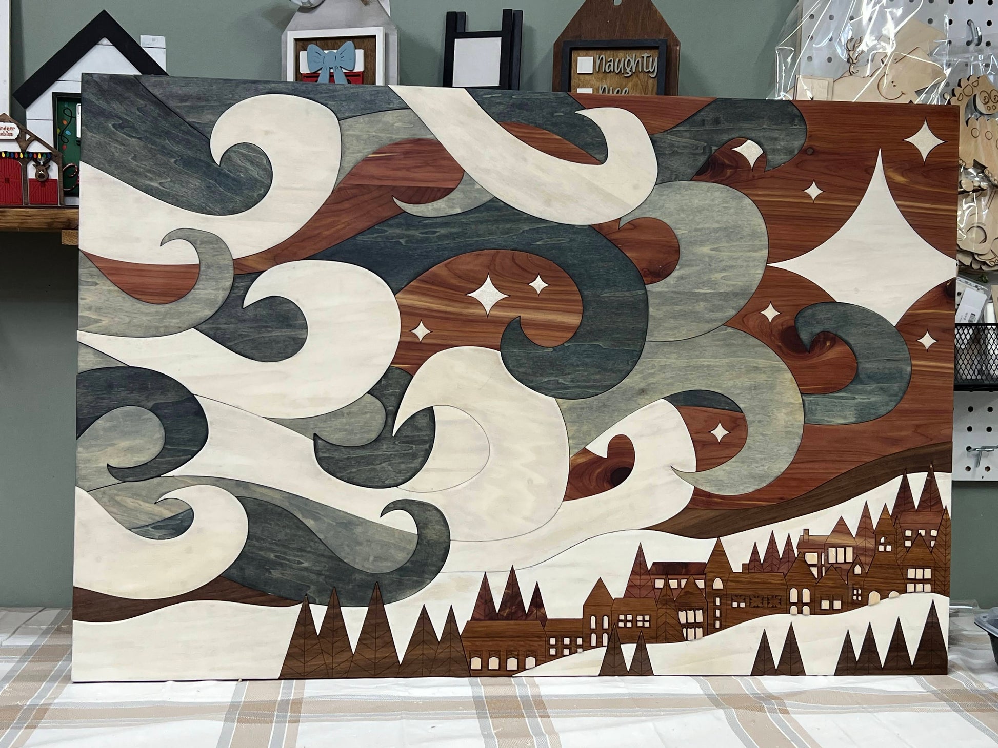 This is a 36"X24" piece made out of different woods to create a stunning design that is perfect for the Winter months! Popular, Cedar, Maple, and Walnut are all used to create this beautiful design.
